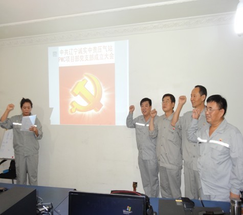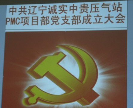 2013年7月21日辽宁诚实中贵线压气站PMC项目部党支部成立大会正式召开,大会由公司党委委员赵树环同志主持,首先介绍了了党支部成立的意义和目的,然后进入了大会流程。通过全体党员民主评议、选举,盛孝福同志当选为PMC项目部党支部书记,师兴华同志当选为党支部组织委员,胡德林同志当选为党支部宣传委员,赵树环同志代表公司党委对党支部成立表式祝贺。党支部全体党员在党旗下进行了郑重宣誓,最后由党支部书记作表态发言。