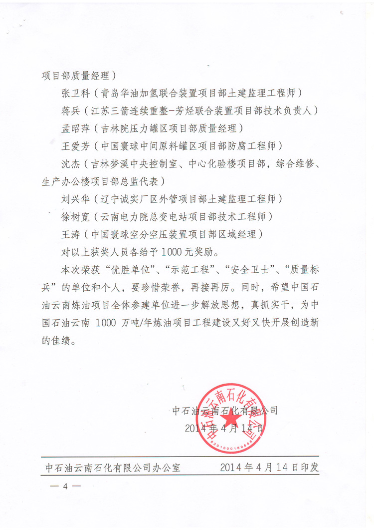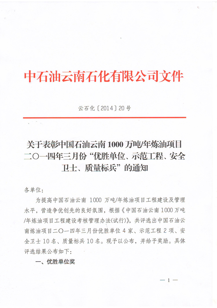 我公司荣获中国石油云南1000万吨/年炼油项目2014年3月份“优胜单位”荣誉称号!